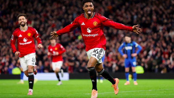 第13分钟,曼联在前场抢断过后连续一脚传球,达洛特传中,库尼亚抢点,佩特罗维奇扑了一下,皮球到了门前,阿玛德·迪亚洛头球轻松将球顶进空门。